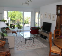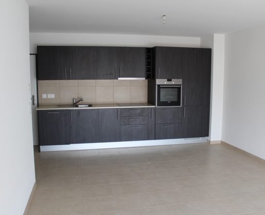 Une cuisine agencée ouverte sur le séjour/salle à manger, une chambre à coucher, une salle-de-bains, un balcon et une place de parc intérieure.