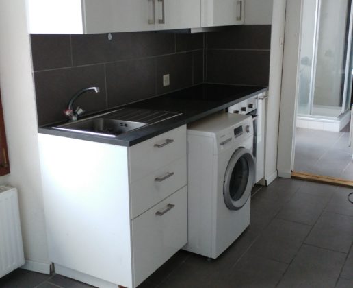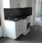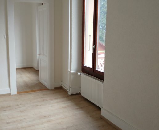 Appartement de 2 pièces à louer en cours de rénovation comprenant une cuisine agencée, un séjour, une chambre à coucher, une salle-de-douches et un balcon.